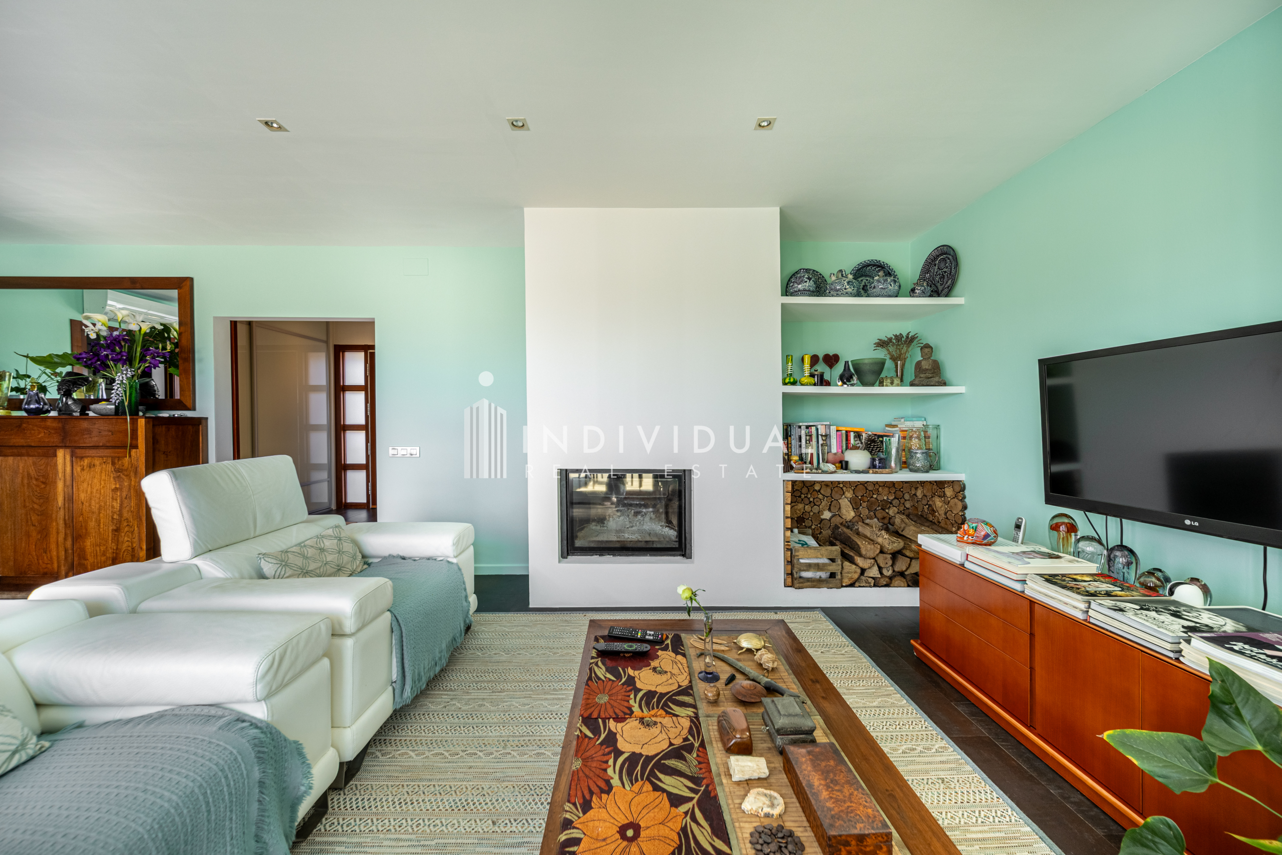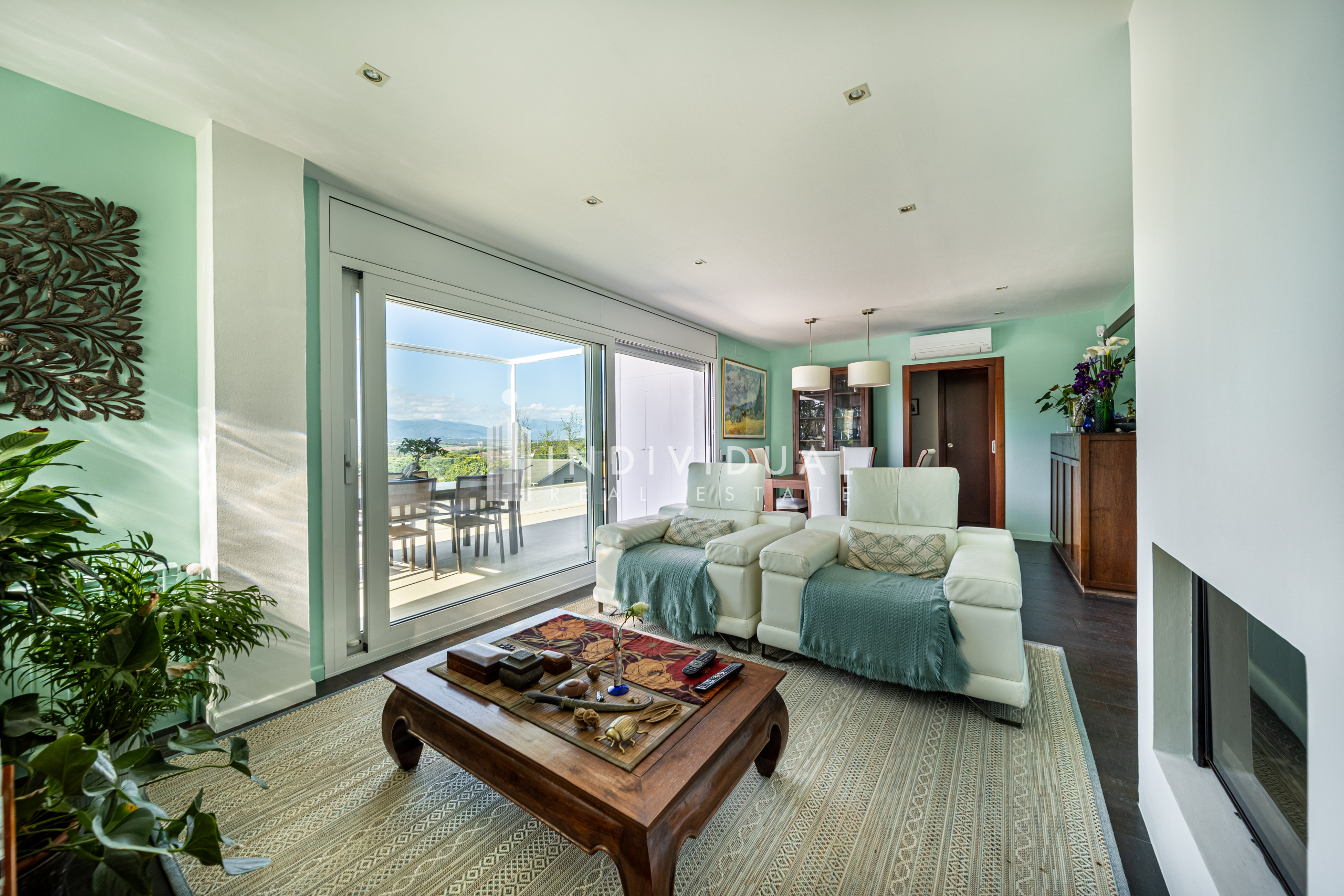 El salón-comedor, con chimenea y grandes ventanales, se abre a la terraza, aportando luz natural y una conexión directa con el exterior.